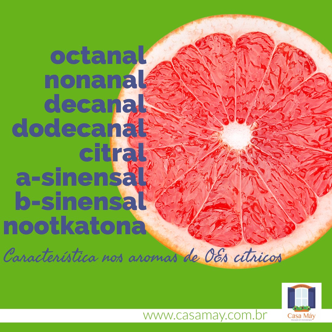 Sobre fundo verde claro, está a foto de uma fatia da fruta grapefruit, com a polpa bem laranja. Ao lado desta imagem, estão escritos vários nomes de moléculas: octanal, nonanal, decanal, dodecanal, cital, a-sinensal, b-sinensal, nootkatona. Depois, está escrito: característica nos aromas de OE cítricos." No rodapé da imagem estão o site da casamay.com.br e o logotipo em forma de janela da escola.